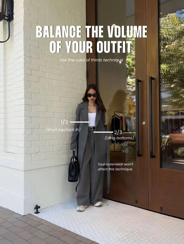Achieving balance in your outfit is all about creating a flattering silhouette. Focus on the proportions of your top and bottoms. For example, go for a shorter top (or tuck it in) and longer bottoms, or vice versa. This method helps create a balanced and elongating effect.